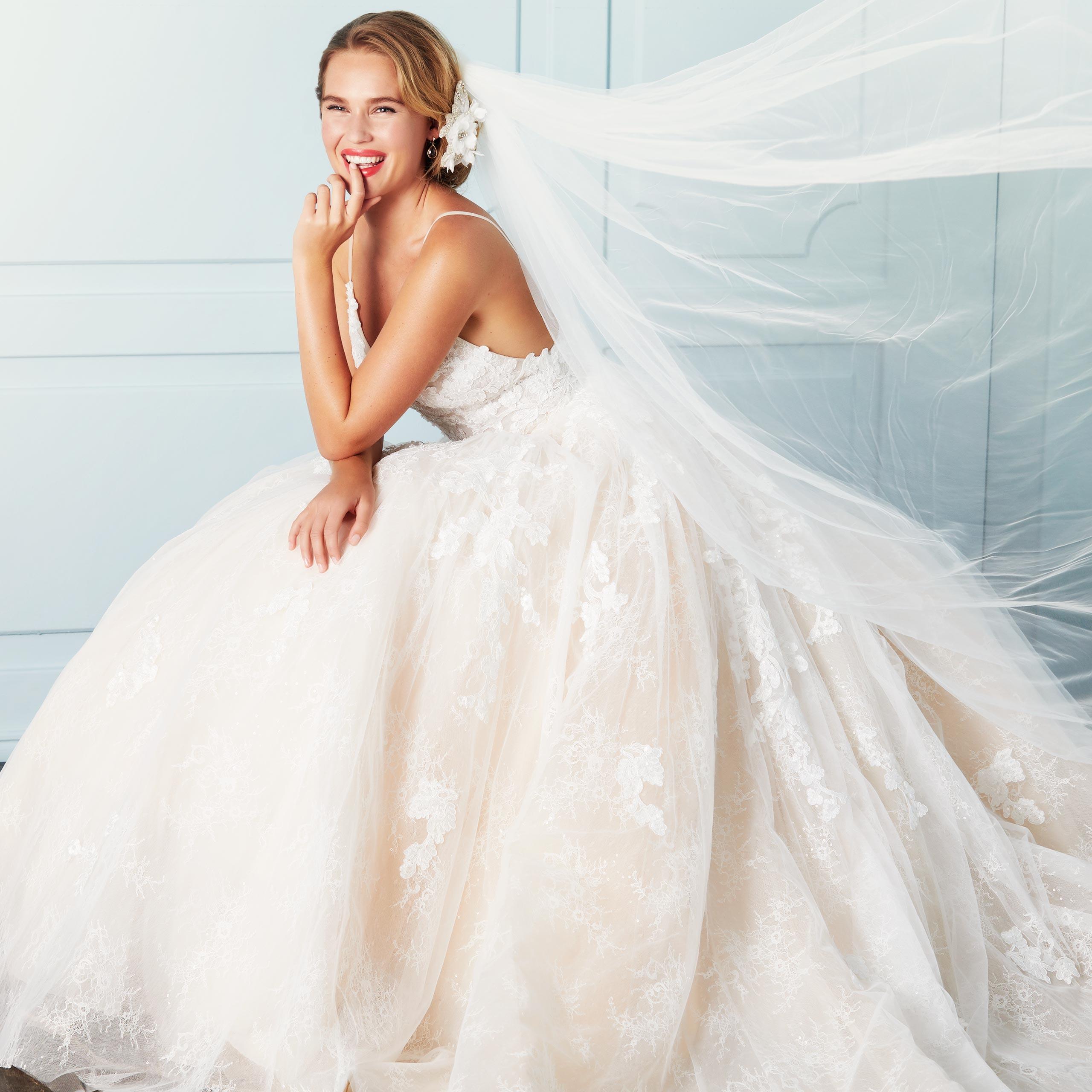 Leichte, komfortable Brautkleider begeistern in femininen Silhouetten und mit gewagten Details. Fließend-weiche Stoffe formen schwungvolle Röcke mit versteckten Taschen.
