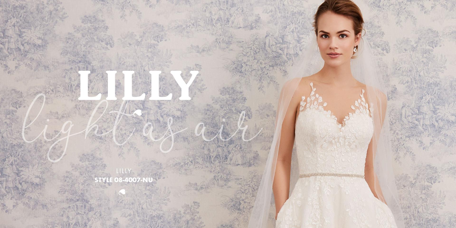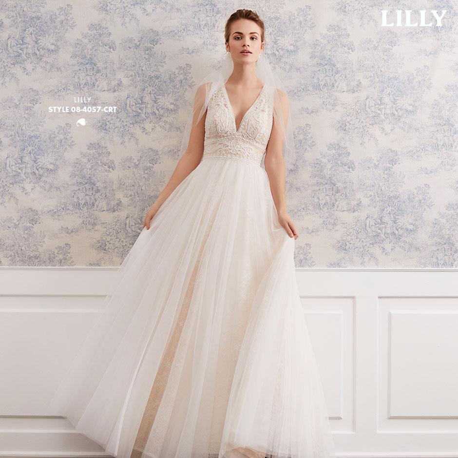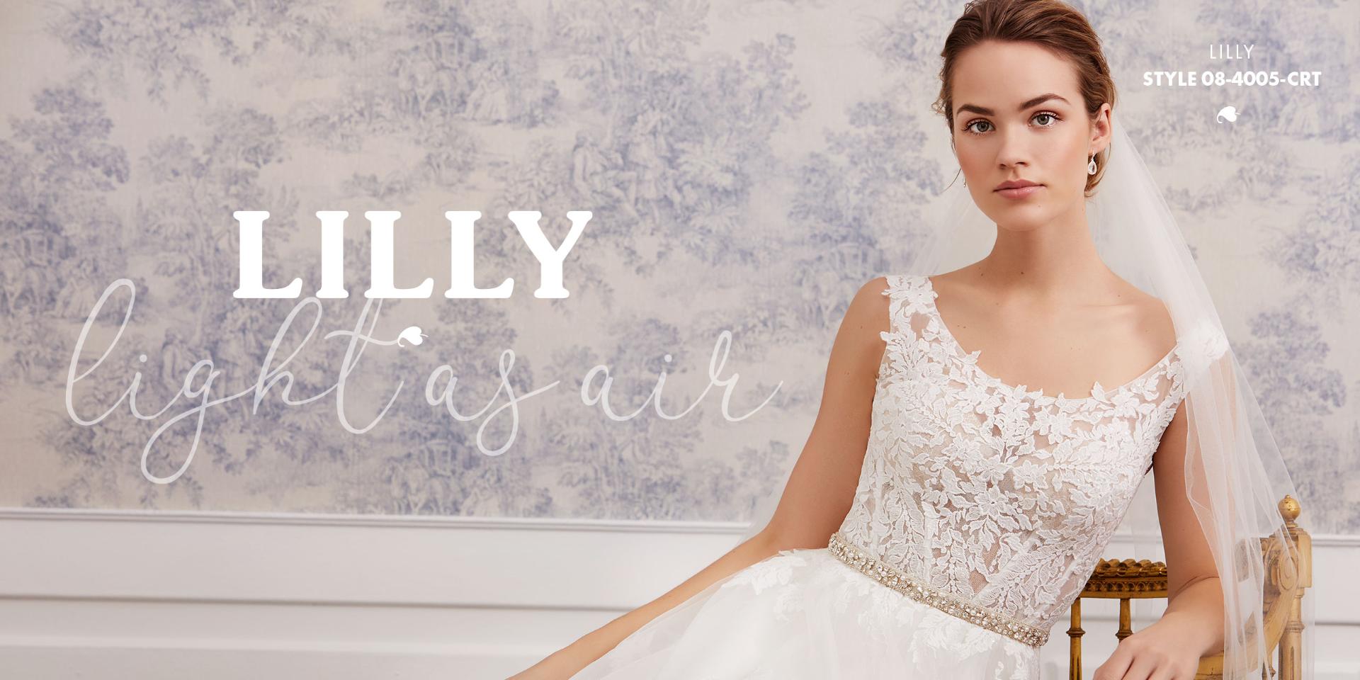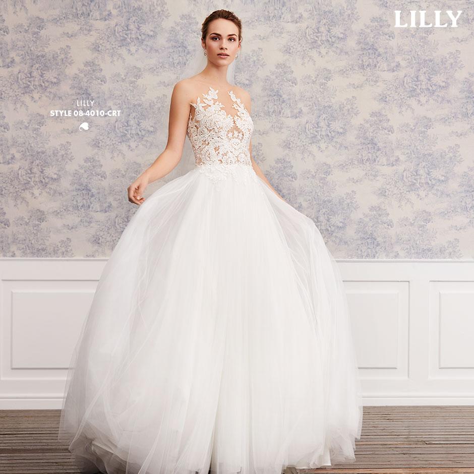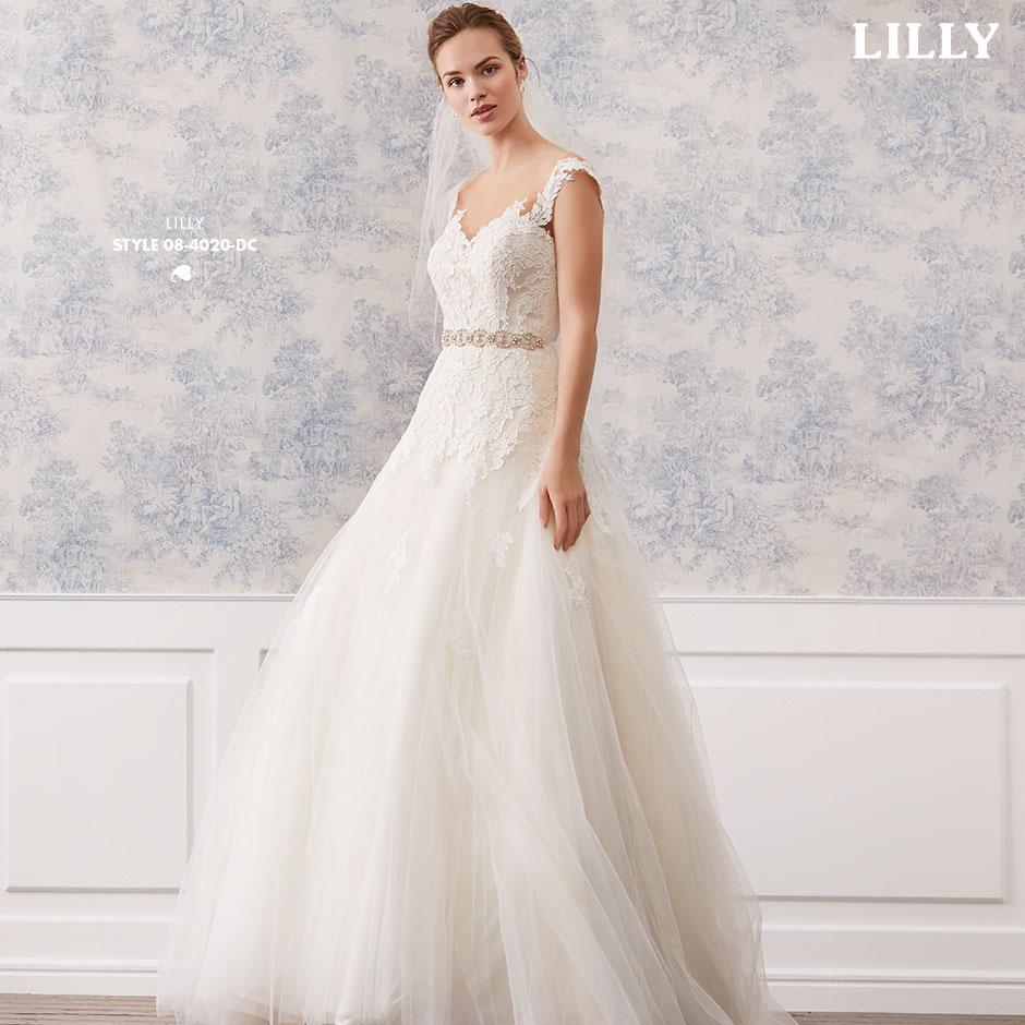 Bei diesem Brautkleid gehen florale Spitzen und duftiger Tüll eine bezaubernde Liaison ein.