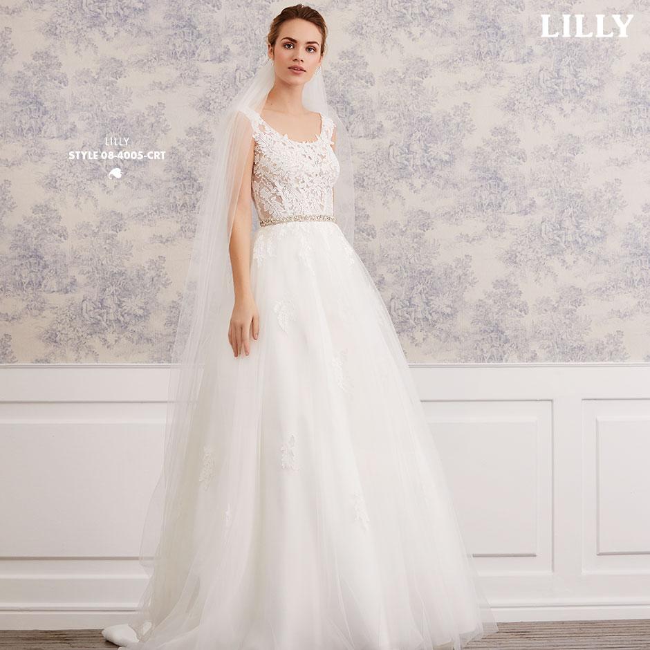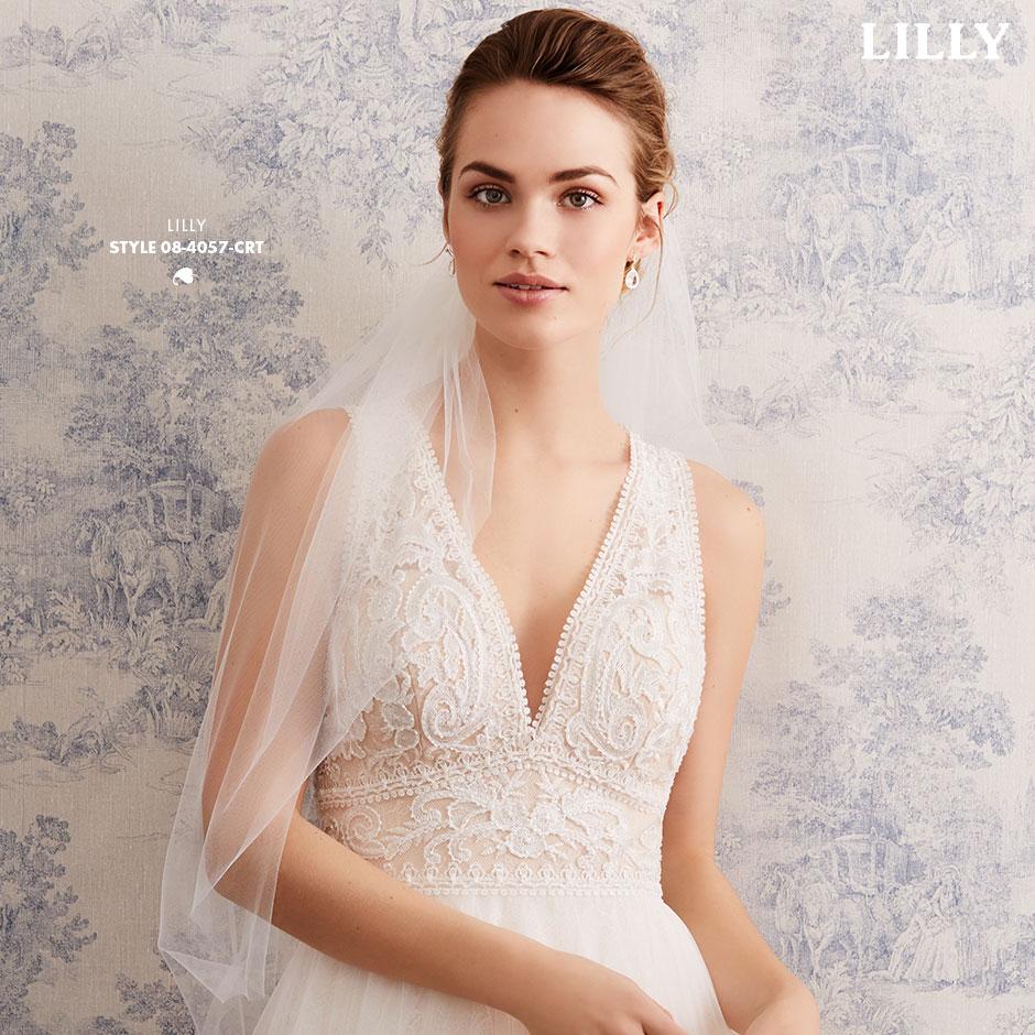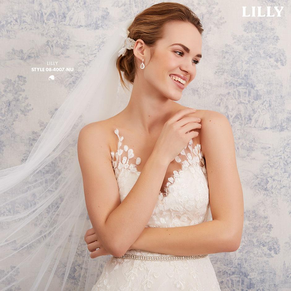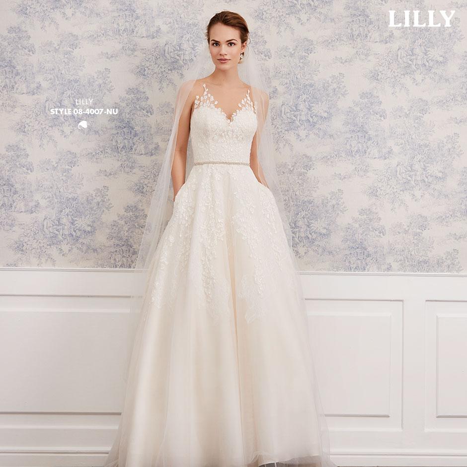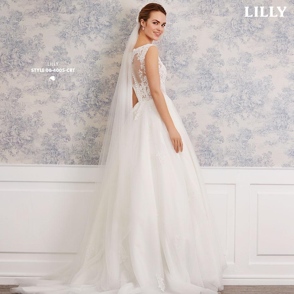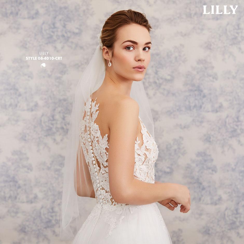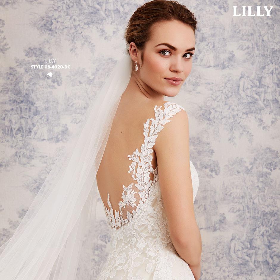 Das ärmellose Brautkleid aus Blüten-Spitzen mit Bateau-Auschnitt und betörenden Transparenz-Effekten, wird hinten mit kleinen Satinknöpfchen verschlossen.