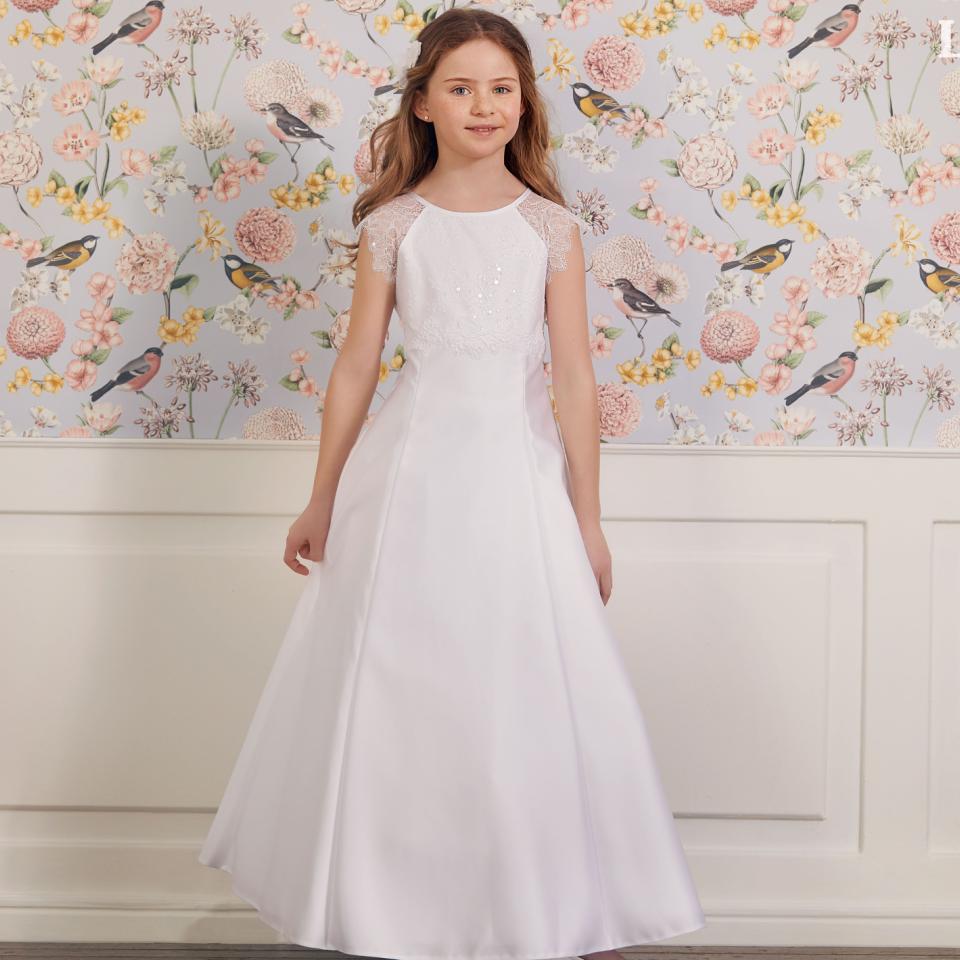 Klassische A-Linie in Satin oder Tüll vereint sich mit zarter Spitze und glänzenden Details zu Kommunionkleider voller Festlichkeit. Mit Volant-Ärmeln, 3/4-Ärmeln oder ärmellos ist für jedes Kommunionkind das richtige Kleidchen dabei. Hübsche Bindegürtel akzentuieren die Taille und sorgen für eine perfekte Passform. Ideal für schlichte Gemüter!