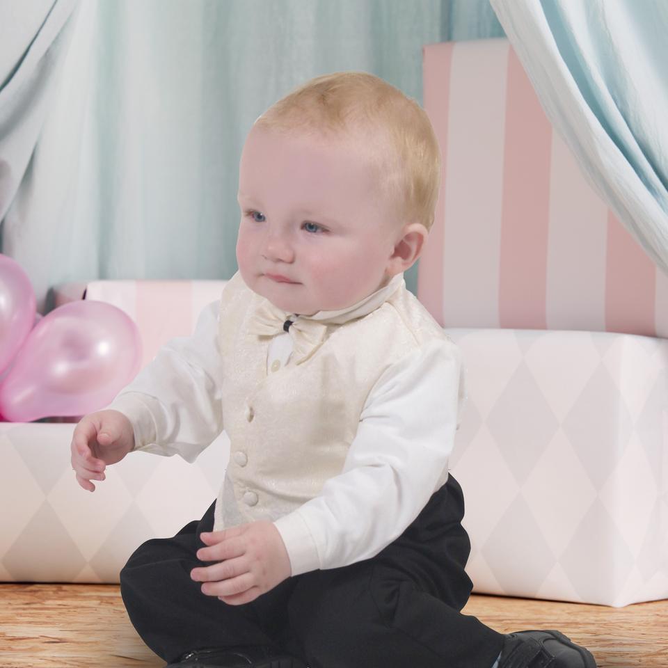 Schicker Anzug für kleine Jungen. Der Anzug besteht aus Hose, cremefarbenem Hemd sowie Weste und Fliege. Der Anzug ist aus einem Stück gefertigt und schließt hinten mit einem Reißverschluss.