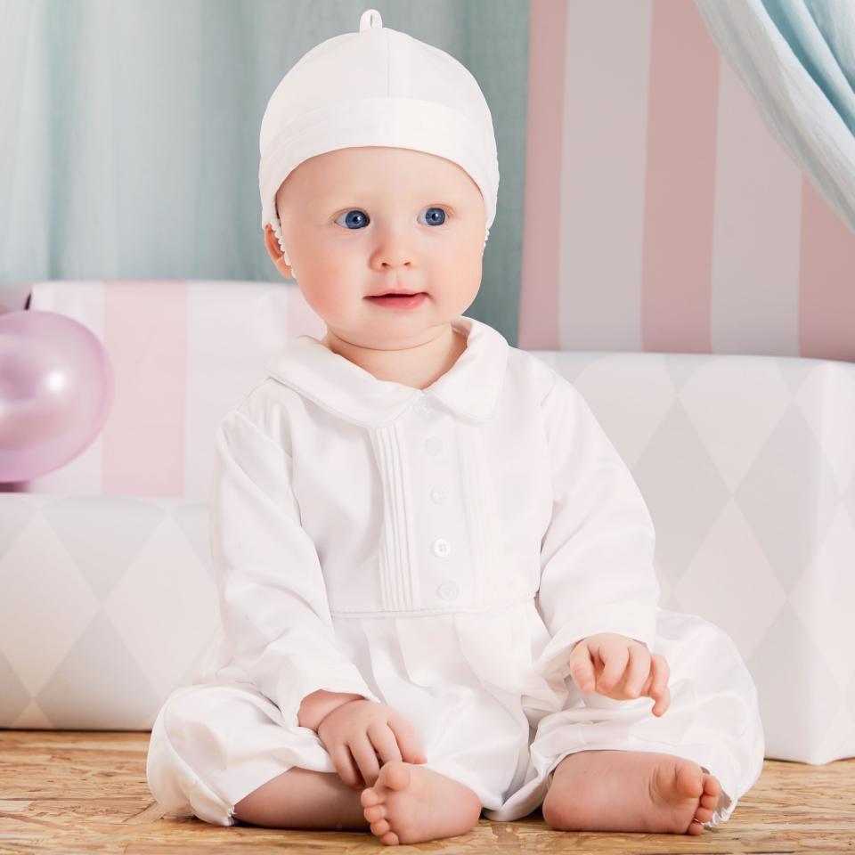 Cremefarbener Taufanzug mit Umlegekragen und durchgehende Knopfleiste. Das niedliche Häubchen ist inkl.